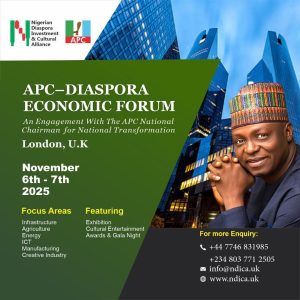 The All Progressives Congress (APC) United Kingdom Chapter , in collaboration with the Nigerian Diaspora Investment & Cultural Alliance (NDICA), is set to host the “APC-Diaspora Economic Forum” in London on November 6th and 7th, 2025. The event, an engagement with the APC National Chairman, Professor Nentawa Yilwatda, aims to mobilize diaspora expertise and capital for Nigeria’s national transformation.