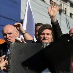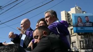 “Out with Milei!” protesters shouted. Milei ducked inside the vehicle as security guards scrambled to shield him from rocks.