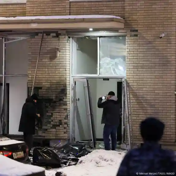 Photographs on the messaging app Telegram showed a destroyed building entrance, rubble, and blood-stained snow.