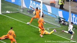 Dortmund’s famous “Yellow Wall” was turned orange by the bouncing Netherlands fans, and they were soon sent into delirium as the Dutch took the lead within three minutes when Xavi Simmons blasted the ball past Jordan Pickford from 25 yards out.