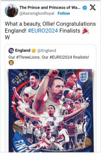 “What a beauty, Ollie! Congratulations England! Euro 2024 finalists,” he tweeted.