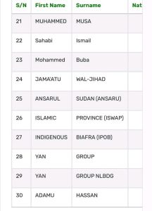 Among those named are persons linked to groups such as Indigenous People of Biafra (IPOB), Ansaru and Islamic State West Africa Province (ISWAP).