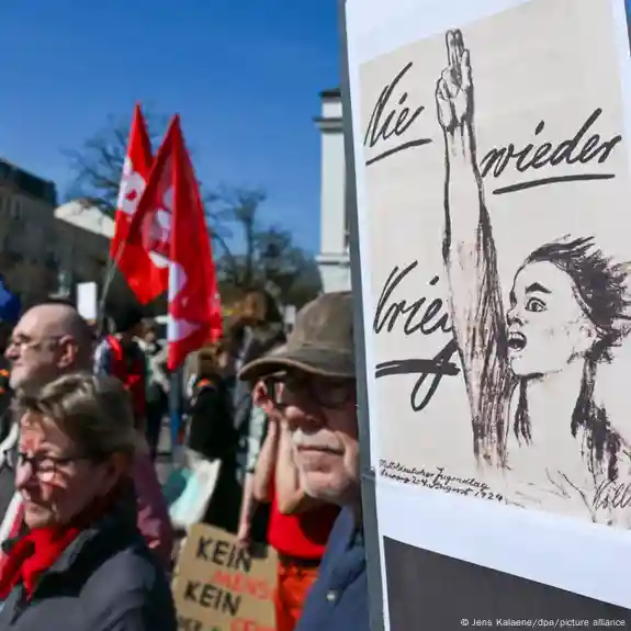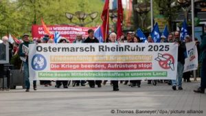 In Bonn, the motto is “Yes to peace — no to combat readiness,” in Kassel “Peace — disarmament — climate protection — come to the Easter march” and in Leipzig “Against rearmament and cuts to social services.”
