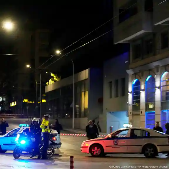 Policemen close the road after a suspected bomb explosion outside of the Hellenic Train offices the company that runs Greece’s railway.Image: Petros Giannakouris/AP Photo/picture alliance
