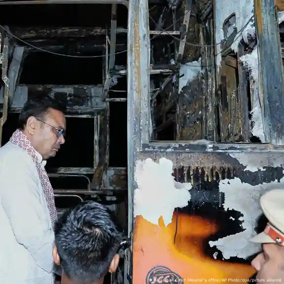 Chief Minister of Rajasthan Bhajan Lal Sharma inspects the aftermath of a bus fire that killed 20