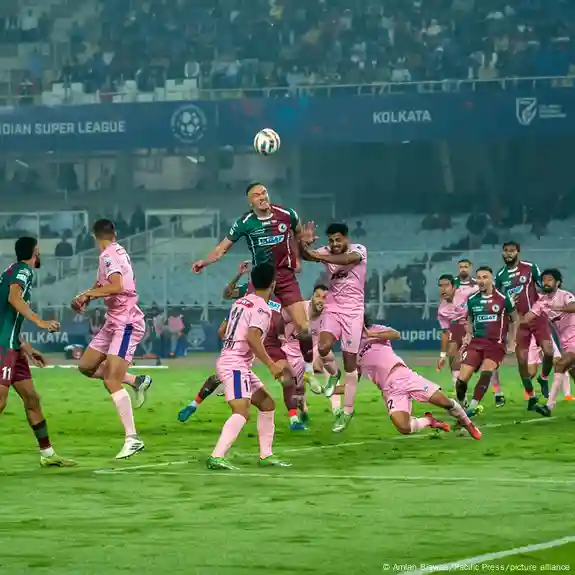 Mohun Bagan (green and red) beat Bengaluru (pink) en route to winning last season’s ISL. But the new season is currently suspended.Image: Amlan Biswas/Pacific Press/picture alliance