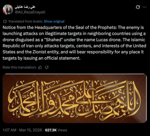 Alireza Enayati shared a notice attributed to Iran’s military command, which said “the enemy” was using drones “disguised as a Shahed (an Iranian-made drone) under the name Lucas drone.”