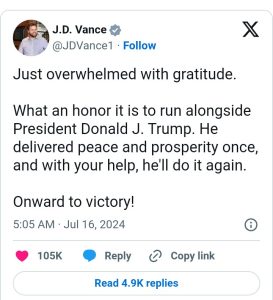 “Just overwhelmed with gratitude. What an honor it is to run alongside President Donald J. Trump. He delivered peace and prosperity once, and with your help, he’ll do it again,” Vance said on social media after his nomination.