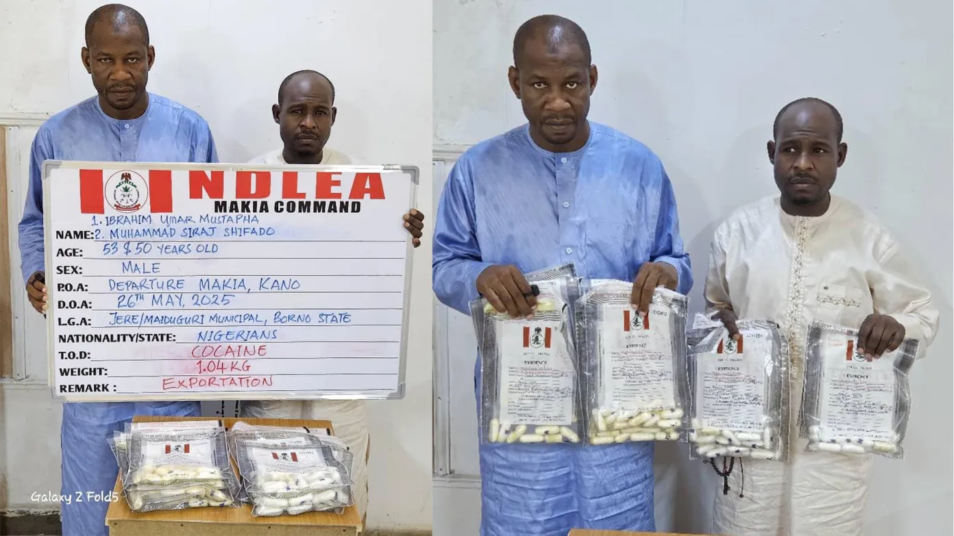 The interdiction of the intending pilgrims at the NDLEA final screening point at the Kano airport was based on credible intelligence. When they were taken for scanning, the result confirmed ingestion of illicit substances. They were subsequently placed on excretion observation during which they excreted 45 wraps of cocaine each, bringing the total for both to 90 pellets with a total weight of 1.04kg.