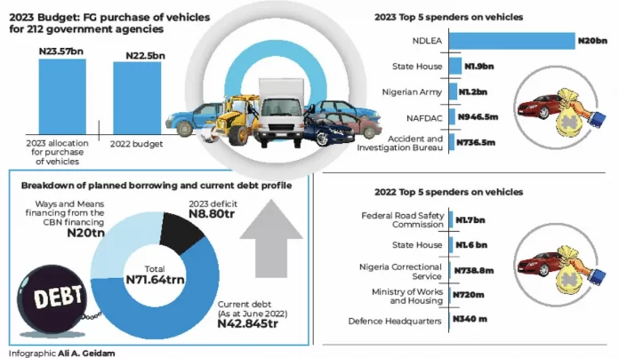 The National Drug Law Enforcement Agency (NDLEA) tops the list of the 20 big spenders with a whopping N2 billion earmarked for the purchase of new vehicles in 2023.