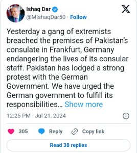 Pakistan’s Foreign Minister Ishaq Dar said in a social media post: “Yesterday a gang of extremists breached the premises of Pakistan’s consulate in Frankfurt, Germany endangering the lives of its consular staff.