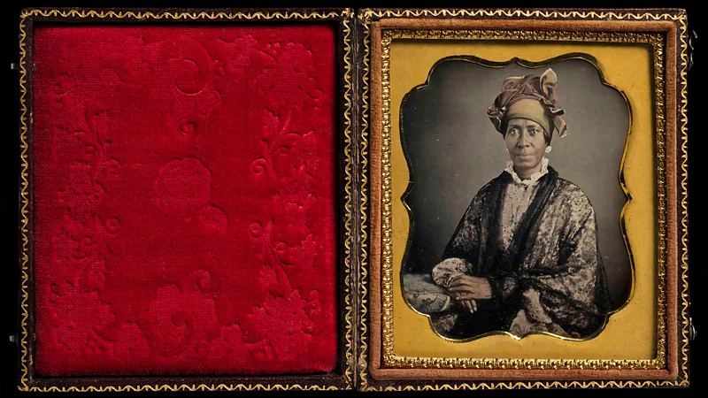 It would be another decade before the US would abolish slavery, and a century before the Civil Rights Act prohibited racial segregation. As a result, the theme of agency is implicit in many of these early images. An 1850s daguerreotype of a woman wearing a tignon (cloth turban) is a reminder of the Tignon Law in colonial Louisiana that required free black women to cover their hair. In response, some women reclaimed the tignon as an object of beauty and pride. This elegant portrait, with its extraordinary detail − from the delicately carved earrings to the weave in the translucent shawl − provides an opportunity for positive self-representation against a background of racial discrimination and negative stereotyping.