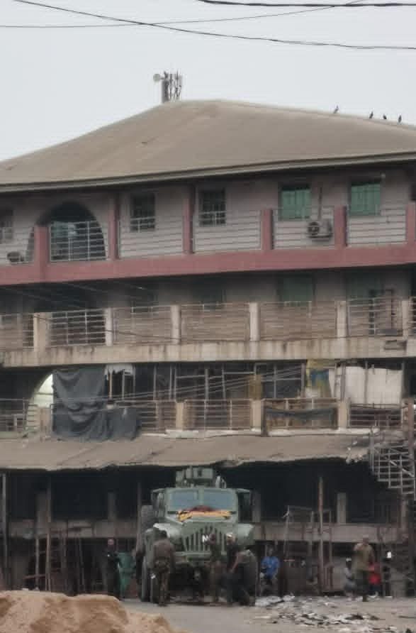A fierce looking armoured personnel carrier (APC) was standing at the gate of the entrance, while armed police men milled around every part of the market.