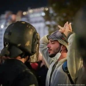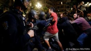 A small group of protesters clashed with riot police in front of Valencia’s city hall toward the end of the march, and police used batons to beat them back.
