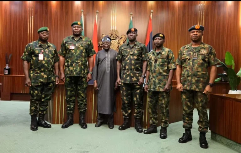 President Bola Tinubu on Monday met for the first time with the newly appointed Service Chiefs at the Presidential Villa in Abuja, their first known gathering since last week’s redeployment.