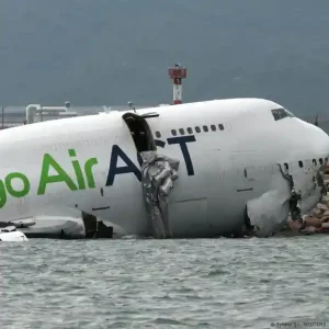 Photos taken after the accident showed the cargo aircraft partially submerged in water near the airport’s sea wall with an escape slide deployed and the nose and tail sections separated.